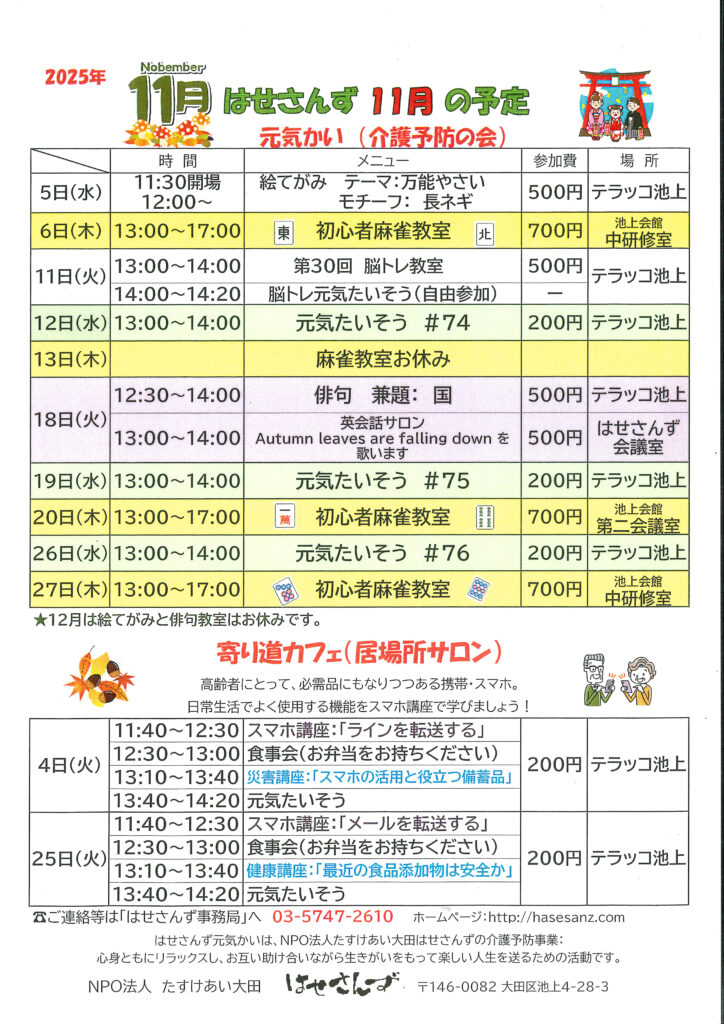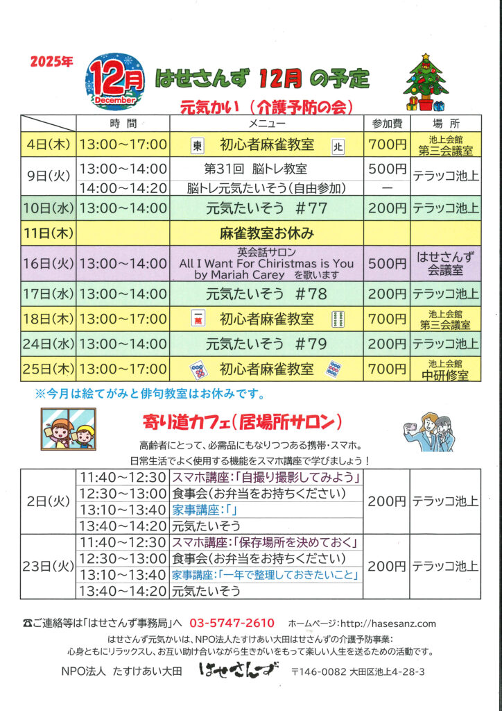 | 申込方法 | 電話にて NPO法人たすけあい大田はせさんず 03‐5747‐2610 または 080-4169-0689(小林) |