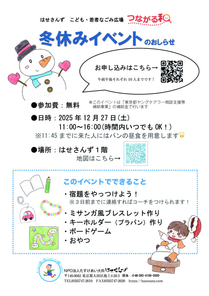 はせさんず こども・若者なごみ広場「つながる和。」では、冬休み最初の土曜日12月27日に、はせさんず1階で、イベントを開きます。